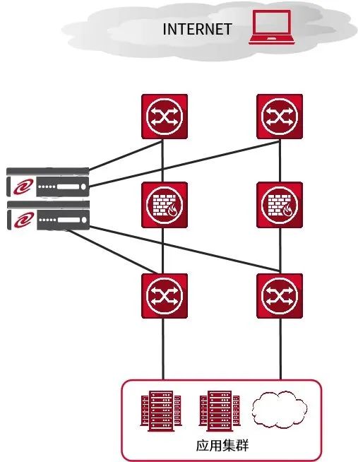 由于用戶數(shù)據(jù)中心已經(jīng)部署完畢,所以負(fù)載均衡設(shè)備旁路模式部署,拓?fù)鋱D如下: