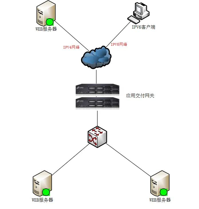 參見如下的網(wǎng)絡(luò)邏輯示意圖,應(yīng)?交付控制器作為 IPv6 和 IPv4 的協(xié)議網(wǎng)關(guān)來部署,同時提供數(shù)據(jù)中心 Web 應(yīng)用服務(wù)器集群的負(fù)載均衡等應(yīng)用交付的功能。數(shù)據(jù)中心內(nèi)部的應(yīng)用程序還沒有經(jīng)過 IPv6 的改造,依然是 IPv4 的環(huán)境,應(yīng)用交付控制器分別連接 IPv6 和 IPv4 兩個網(wǎng)絡(luò),通過虛擬服務(wù)器方式將數(shù)據(jù)中心的 Web 應(yīng)用發(fā)布在 IPv6 的網(wǎng)絡(luò)中(圖中以虛擬服務(wù)器vs_main: 2017:1::158:80 對 IPv6 的客戶端發(fā)布),IPv6 網(wǎng)絡(luò)中的客戶端可以訪問應(yīng)用交付網(wǎng)關(guān)發(fā)布的 IPv6 的虛擬服務(wù)器,通過代理的方式將請求轉(zhuǎn)發(fā)給數(shù)據(jù)中心內(nèi)部的真實服務(wù)器,得到響應(yīng)內(nèi)容之后將返回的內(nèi)容再轉(zhuǎn)換成 IPv6 數(shù)據(jù)包返給客戶端,從而保證客戶端能夠在?個 IPv6 的網(wǎng)絡(luò)中訪問數(shù)據(jù)中心 IPv4 的應(yīng)用。